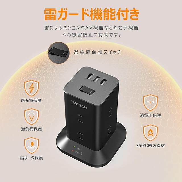 商品名:延長コード2m usb 電源タップ タワー TESSAN テーブルタップ タコ足配線 蛸足コンセント 8個AC差込口 3個USBポート 180°スイングプラグ 雷ガード 一括スイッチ ブラック