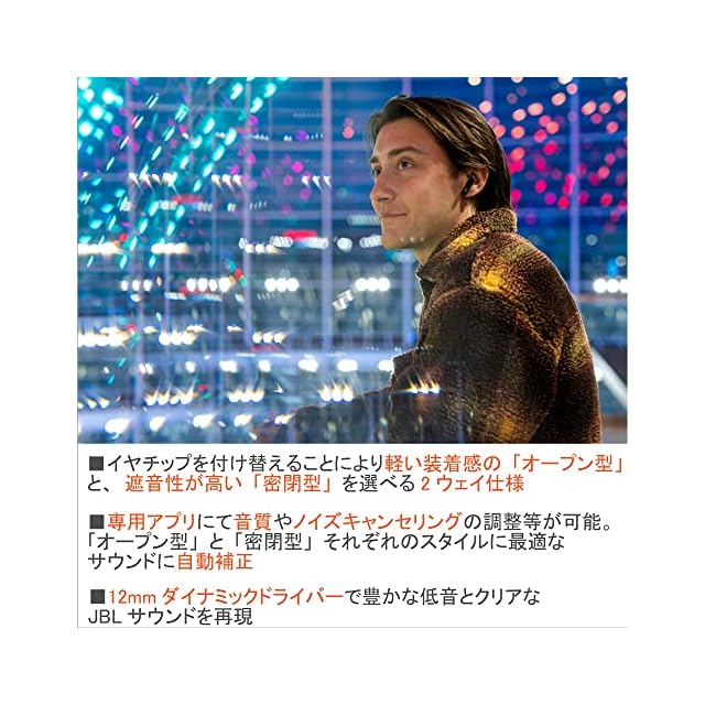 2種類のイヤーチップの付け替えにより、「ながら聴き」ができる軽い装着感のオープン型と、遮音性が高く音楽に集中できる密閉型のJBL初の2ウェイ使用を可能にしたモデルです。