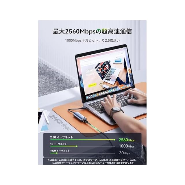 「2.5Gbps 高速イーサネット接続」有線LANアダプター 2.5GbpsはUSB-Aポートと2500Mbpsネットワークの接続に対応しており、パソコン、タブレットに1000Mbps帯域の2.5倍の高速通信を提供します。ワイヤレスWIFIの干渉、遅延、不安定などの問題を解決し、ネットゲーム、ビデオ会議、ファイル転送などより速く、より安定した環境を提供します。▲ご注意:2.5Gbpsに達するには、カテゴリー6A(CAT6A)またはその以上規格のイーサネットケーブルを使用する必要があります。