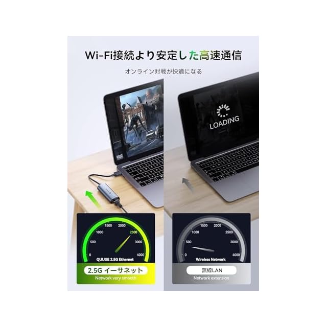 「安定した高速通信」USB LAN変換アダプター 2.5Gbpsは電波干渉のない有線LAN接続を採用しており、切断のストレスもなく安定した高速通信で、オンラインプレイも快適です。Windows、iOS、Linuxなどシステムに対応でき、10/100/1000/2560Mbpsの転送速度により、WiFiのないところでも超高速有線ネットワークを楽しむことができます。▲ご注意:2.5G 有線ランアダプターは switch(スイッチ)に非対応。