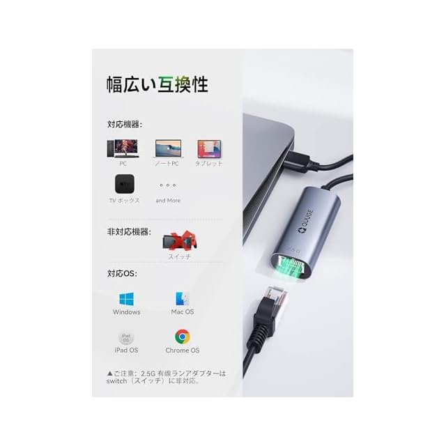 商品名:QUUGE 有線LANアダプター 2.5Gbps 超高速通信 USB LAN変換アダプター 2500Mbps USB3.0 RJ45 変換 一発認識 10/100/1000/2500Mbps超高速 イーサネットアダプタ USB ギガビット 2.5GbE対応 イーサネットアダプタ LANアダプター ドライバー不要 Windows/Mac OS/Linus等対応