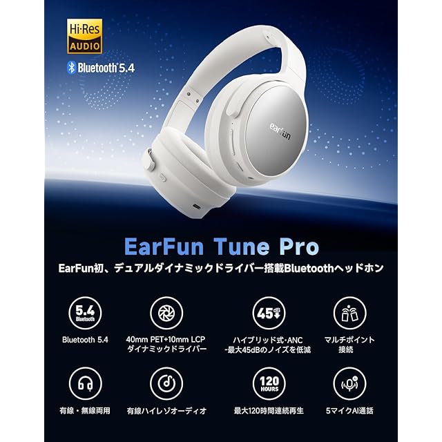 【VGP 2025 金賞】EarFun Tune Proワイヤレスヘッドホン Bluetooth 5.4/【40mm +10mmデュアルドライバー/ 無線& USB-C & AUX有線接続】/ 最大45dBのノイズを低減ノイズキャンセリングヘッドホン/ 最大120時間連続再生/シアターモード/マルチポイント対応/密閉型/有線ハイレゾ/専用アプリ対応(ホワイト)