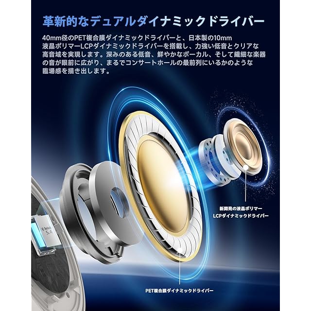 【2基のドライバーによる繊細でクリアな音質 & シアターモード】EarFun初のデュアルダイナミックドライバー搭載Bluetoothヘッドホン、新登場!40mm径のPET複合膜ダイナミックドライバーと、日本製10mm液晶ポリマー(LCP)ダイナミックドライバーを組み合わせ、力強い低音とクリアな高音を実現!深みのある低音、鮮やかなボーカル、繊細な楽器の音が耳全体へ広がり、まるでコンサートホールの最前列で聴いているかのような臨場感を味わえます。さらに、日本オーディオ協会(JAS)認定のハイレゾオーディオ対応。AUXケーブルを接続するだけで、ハイレゾサウンドをお楽しみいただけます。シアターモードとの組み合わせで、映画館のような三维空間の音響体験を楽しむことができます。