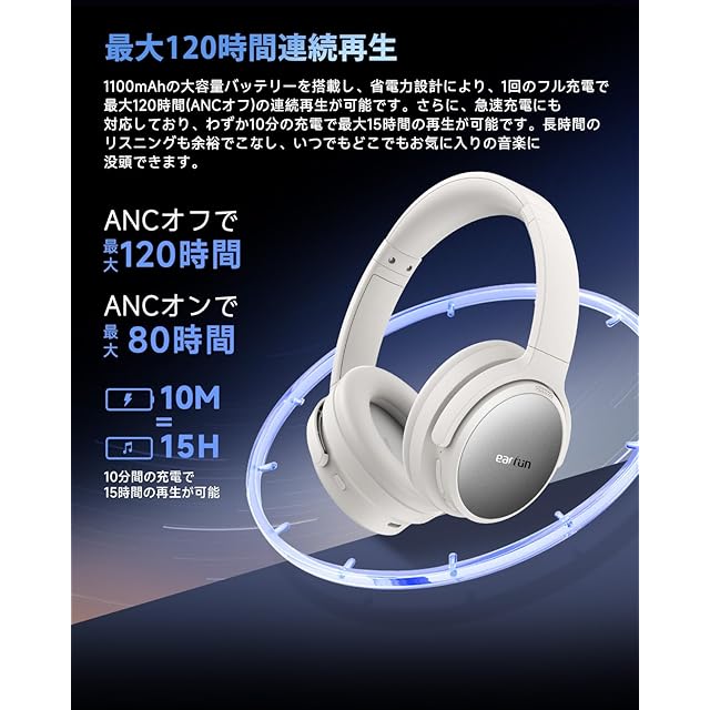 【最大120時間連続再生&急速充電】1100mAhの大容量バッテリーを搭載し、省電力設計により、フル充電で最大120時間(ANC オフ)の連続再生が可能です。さらに、急速充電にも対応しており、わずか10分の充電で、最大15時間の再生を楽しめます。長時間のリスニングもストレスなく、いつでも、どこでもお気に入りの音楽に没頭できます。