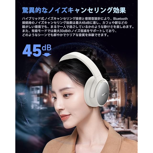 【最大45dBのノイズキャンセリング】 ハイブリッド式ノイズキャンセリング技術と密閉型設計により、Bluetooth接続時のノイズキャンセリング効果は最大45dBを実現有しました。有線接続時でも、最大30dBのノイズ低減が可能です。カフェや駅などの騒がしい環境でも、まるで自分だけの静かな空間にいるかのような心地よさを楽しめ、どのようなシチュエーションでも鮮明でクリアなサウンドを実感いただけます。