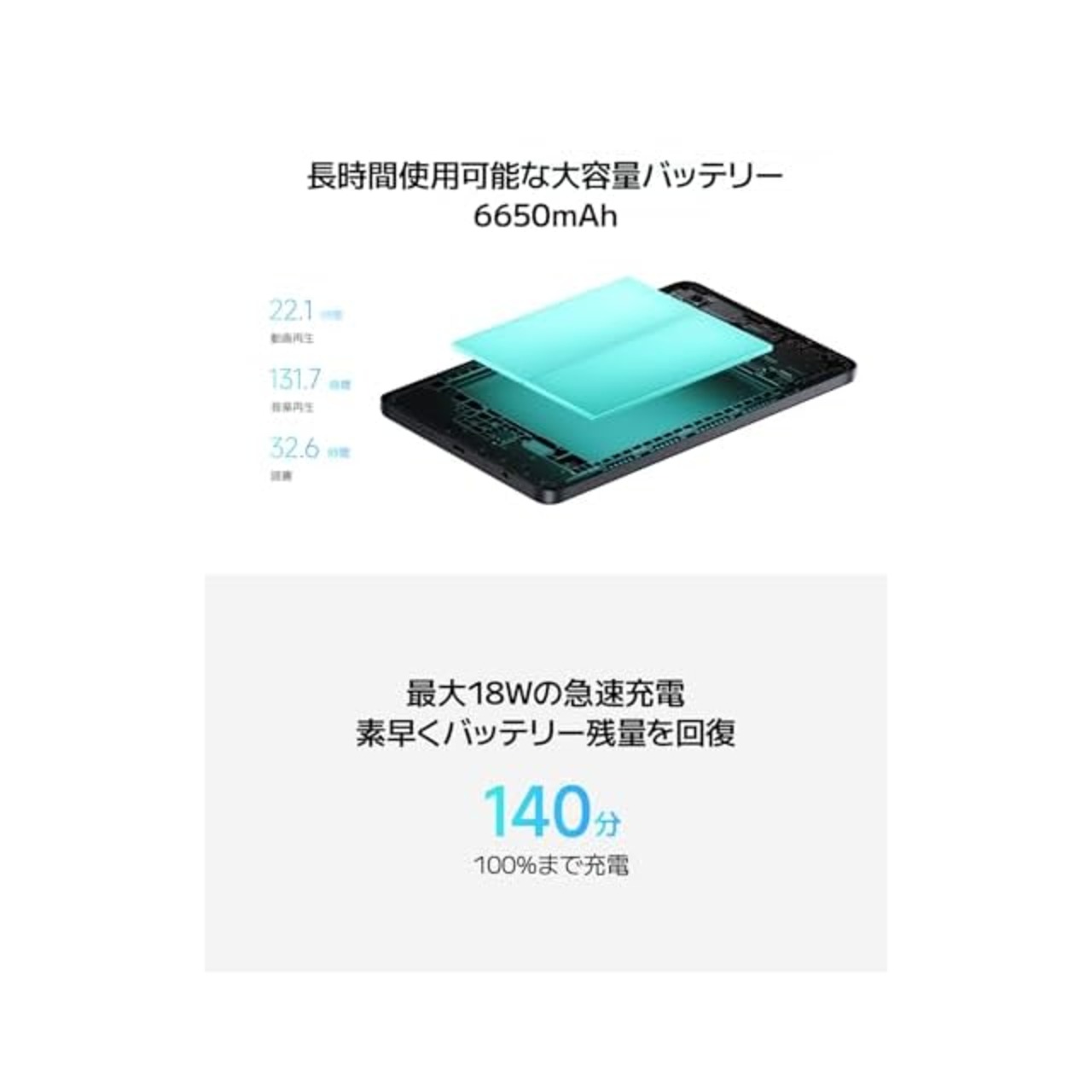 【6650mAhバッテリー、18Wの急速充電対応】25.2時間の動画再生、163.8時間の音楽再生、34.2時間の読書、6650mAhの大容量バッテリーにより、想像以上の駆動時間を実現。Redmi Pad SE 8.7シリーズは汎用性の高い18Wの急速充電に対応しており、急なバッテリー切れでも、しばらく充電すればすぐ回復します。