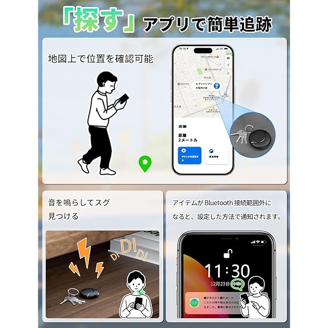 【「探す」ネットワーク対応】iPhone、iPad、Mac、AppleWatchに対応する「探す」ネットワークを使えば、紛失した物を素早く正確に見つけることが可能です。ご注意:本製品はiOS専用で、Androidには対応していません。位置情報の更新は、製品周辺のAppleデバイスの数に応じて行われます。(すべてのAppleデバイスに対応していますが、近くにデバイスが少ない場合は、位置更新が遅くなる可能性があります。更新が一時的に停止することもあります。iOS や MacOS のバージョンは 14.6 以降です)