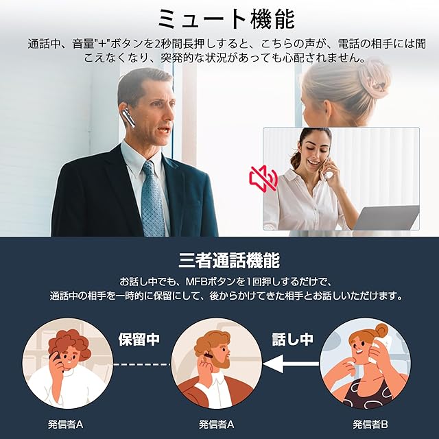 【ハンズフリー通話&ミュート機能搭載】:弊社のBluetoothヘッドセットはAACおよびSBCコーデックをサポートしており、クリアで高品質な音声通話を提供します。通話中の音声がより鮮明になり、重要な会話を確実に伝えることができます。プライバシー保護のためのミュート機能も搭載されており、通話中に音量「+」ボタンを2秒間長押しするだけで、相手にこちらの音声が聞こえなくなります。会議中や突発的な状況においても非常に便利です。