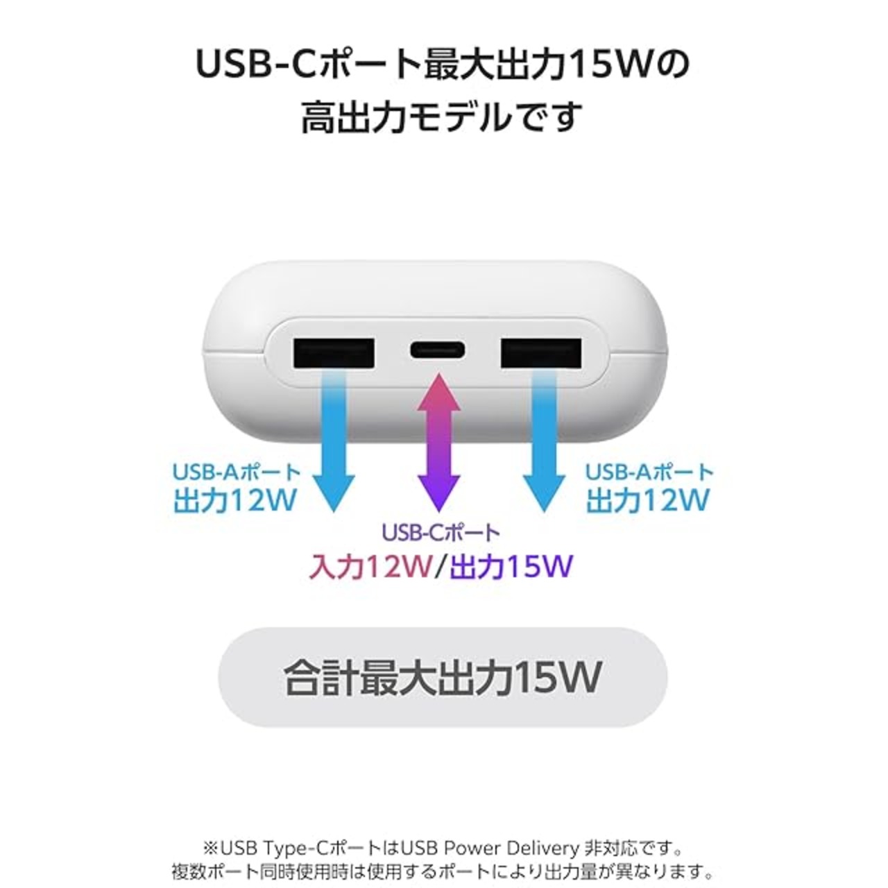 USB-Aポート×2、USB Type-C(TM)ポート×1の3ポートから出力可能。USB-Aポートからは最大12W、USB Type-Cポートからは最大15Wで充電できます。