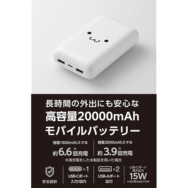 商品名:エレコム モバイルバッテリー 20000mAh 15W リチウムイオン電池 USB-C USB-A 合計3ポート しろちゃん EC-C39WF