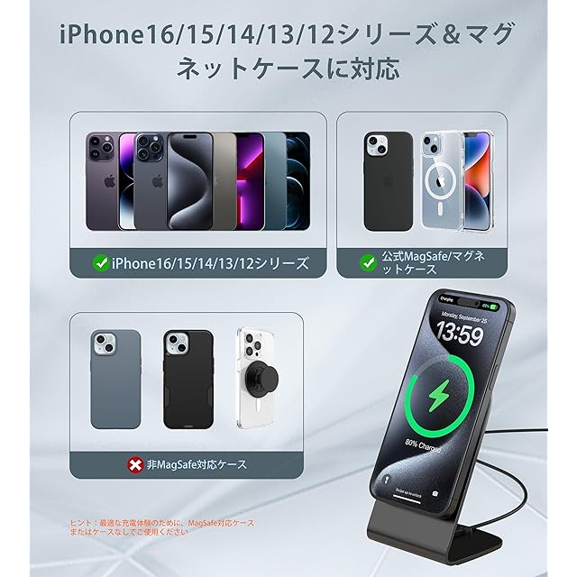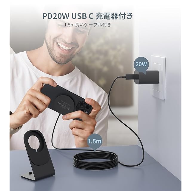 【MagSafe充電器+ 20W PD USB-C充電器+MagSafe充電スタンド】 人気のMagSafe対応ワイヤレス充電器、専用スタンド、PD 20W USB-Cアダプターの3点セットです。iPhone 12〜16シリーズにピタッとくっついて、安定して充電できます。※ご注意:①付属のアダプターは有線急速充電にも対応。②スタンドは同梱のmagsafe充電パッド専用です。③ケースを付けたままご使用になる場合は、MagSafe対応のマグネット付きケースをご使用ください。④3mm以上の厚さの携帯電話ケースや金属物(鍵、クレジットカード、金属製の携帯電話ケース、金属リング)を充電器と充電デバイスの間に置かないでください。磁石のないケースには対応しておりません。