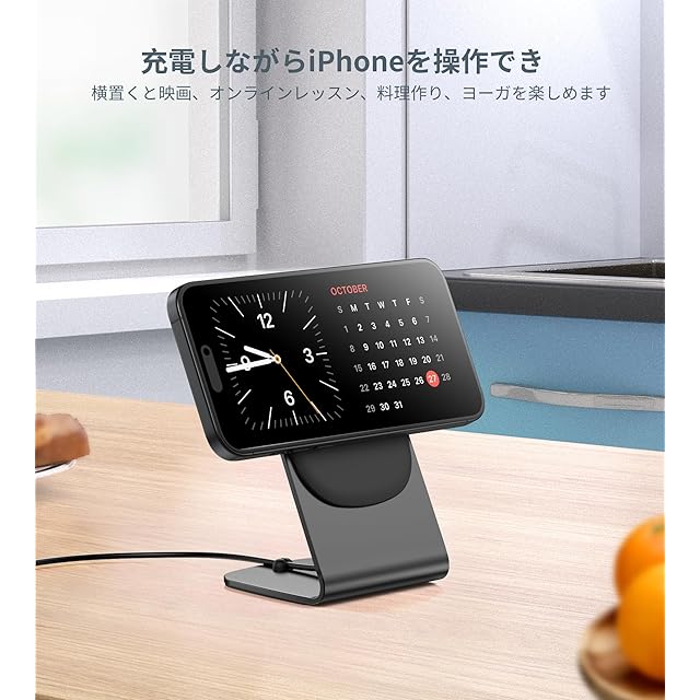 【ワイヤレス充電パッドとマグセーフ充電スタンドを切り替えられる】付属のスタンドは、同梱のmagsafe充電器を取り付け・取り外し可能です。取り付けるとマグネット式スタンドとして使用でき、強力な磁力でしっかり吸着し、落下の心配がありません。自宅・オフィス・テレワークに最適です。取り外せば充電パッドとして単体で使え、ピタッと正確に吸着するため、ズレなく高効率に充電できます。