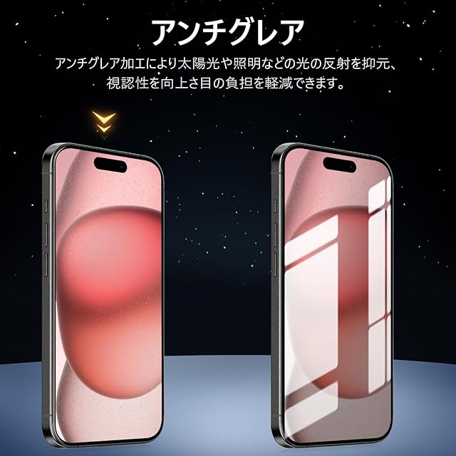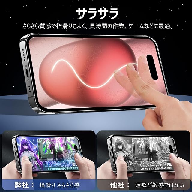 【アンチグレア・指紋防止・高感度タッチ】 アンチグレア(非光沢)タイプのさらさらで快適な操作感。光の反射を軽減し、より目に優しくちらつきを抑えます。同時に、iPhone15プラス ガラスフィルムには撥油コーティングが施されており、指紋や汚れなどに強くなめらかな操作感を実現、付着した汚れなどは簡単に拭きとれます。こちらは高耐久撥油コーティングが施され、つるつるな滑り感を実現!ゲームをする人におすすめです。