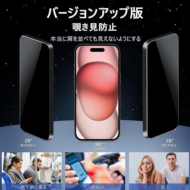 【覗き見防止・プライバシーフィルム】 覗き見防止技術により、左右の視野からの視線を防ぎ、画面のプライバシーを守ります。電車などでも安心のプライバシー保護フィルムです。MINIKAのiPhone15Plus 覗き見防止フィルムは斜めから見るとブラインドルーバーにより画面が真っ黒になりますが、真正面から見ると高透過率ではっきり見ることが出来ます。