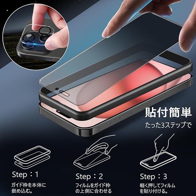 【ガイド枠付き・貼付け簡単】 ガイド枠をはめる→上側に合わせて、 いPhone15Plus ガラスフィルムを置く→軽く押すだけで自然に吸着。 フィルム貼りことが苦手の方でも簡単に貼る事が可能です。また、縁にラウンドエッジ加工が施されており、iPhone本体の縁に適度なスペースを残すデザインとなっており、フィルムの剥がれや浮き上がりを防止し、スマホケースと干渉せずに快適に使えます。