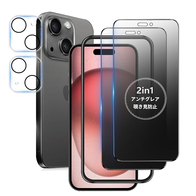 【覗き見防止 + アンチグレア / 2枚セット】 iPhone 15 Plus ガラスフィルム 覗き見 さらさら いPhone15Plus 保護フィルム サラサラ アイフォン15プラス 覗き見防止フィルム 指紋防止 iPhone15 Plus カメラフィルム 付き