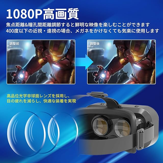【非球面光学レンズ&放熱性優】vrメガネ高品質の非球面光学レンズを搭載し、目を保護できている上で刺激も減少でき、目の疲れを軽減する。フロントパネルは放熱性に優れた粘着設計で、通気性に優れているのでスマホ使用時の熱を内部から逃し、視界が曇るのを防ぎます、長時間使っても暑さを感じません。放熱性が抜群!