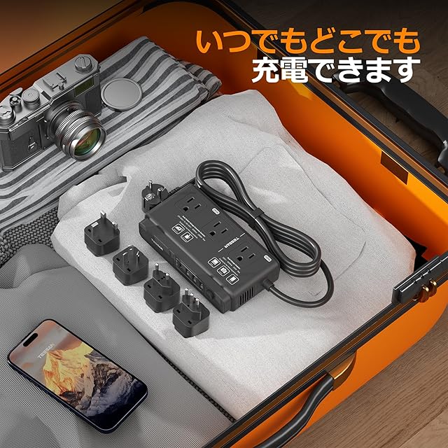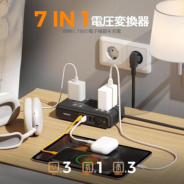 【7台同時に充電可能】 AC100VとDC12Vに変圧してAC家電製品とDC電子機器のいずれも対応できるダウントランス変圧器。ACコンセント3口とUSBポート4口(うち1口はUSB-C)を搭載。USB-Aポートは2.4A、USB-Cポートは3A出力に対応。 海外旅行中でも複数のデバイスをまとめて充電できます。宿泊先でのコンセント不足を解消できます。