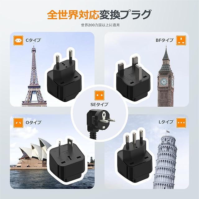 【トラベル用海外変圧器】変圧器・変換プラグ・電源タップ・USB充電器・アダプターがひとまとめになった便利な5in1セットです。220Vを110Vに変換できる海外対応の電圧変換器で、日本の電気製品も安心して使えます。C・BF・O・Lタイプの世界対応変換プラグに加え、SEタイプも付属。ヨーロッパ(イギリス、フランス、ドイツ、イタリア)、オーストラリア、中国、ニュージーランド、ドバイなど、多くの渡航先にこれひとつで対応可能です。
