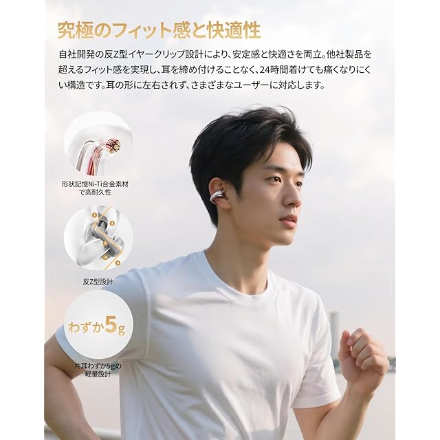 【片耳5g未満、長時間でもストレスフリー】人間工学に基づいた反Z型イヤークリップ設計と形状記憶合金(ニッケルチタン)構造により、耳にしっかりフィットしながらも締め付け感ゼロ。片耳5g未満の軽量設計で、24時間装着しても疲れにくく、どんな耳の形にも対応します。在宅ワーク、ジョギング、通勤など幅広いシーンで快適に使える耳挟み式イヤホンです。