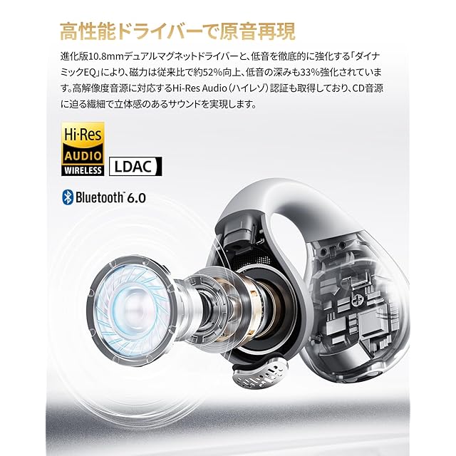 【10.8mm大口径ドライバー搭載、オープン型でも圧巻の音質】本製品は10.8mmの大型ダブル磁気ドライバーを搭載し、従来品より52%強化された磁力と33%深まった低音再現力を実現。さらにHi-Res AudioおよびLDACにも対応し、開放型とは思えないほどのクリアで立体的な音を提供します。イヤーカフ型でありながら、CD音源に匹敵する高解像度サウンドをご体感いただけます。(※LDACコーデックはAndroidデバイスでのみ対応しております。iPhoneはLDACに対応しておりません。)