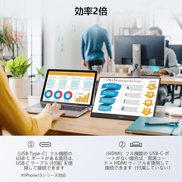 【USB Type-Cケーブル1本で接続&効率2倍】このポータブルモニターには2つの全機能USB Type-Cポートが搭載されており、スマホやPCをUSB Type-Cケーブル一本で簡単に接続するだけで画面が表示されます。特別なドライブや電源を必要とせず、標準的なHDMIポートもあわせて搭載されています。効率的に仕事を処理し、一度に複数のタスクを処理できます。例えば、メールを確認しながら文書編集や、インターネットでの資料検索と同時にメモを取ることができます。*注意:使用中のデバイスのUSB Type-CポートはDisplayPort Altモードをサポートしている必要があります。もしディスプレイの輝度や音量が低い場合は、15W以上の電源アダプターを使用して電力を供給してください。(アダプターとHDMIケーブルは付属品に含まれません)