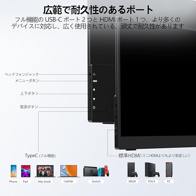 【商品&サポート】①商品出荷前に100%検品し、初期不良などの心配がございません。30日間無料返金と交換が対応します。ご購入日から1年間が付き、登録すれば、さらに2年間も延長できます。期間に製品は不具合が生じた場合は(人為的でない)、返金、交換、修理が対応します。②アフターサービス:当社はモバイルモニターの専門メーカーであり、技術問題が年中無休で対応できます。ご不明な点やご質問がございましたら、お気軽にご連絡ください。