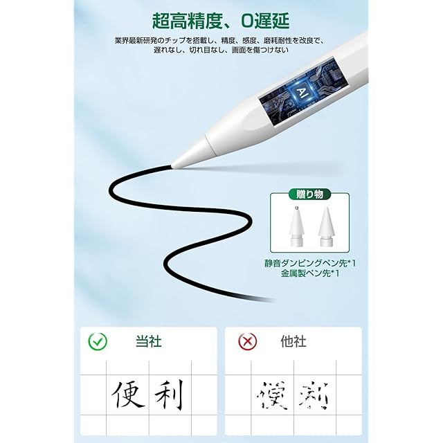 【パームリジェクション・傾きを感知】誤作動防止と傾きを感知機能が搭載されていますので、手のひらをiPadスクリーンに置いて心地良く描けます、チップの配置角度によって線の太さを動的に調節することがで鉛筆のように楽に使えます!特製ペン先は手軽に交換でき、Apple pencil(1/2)互換性があり、幅広く使えます。
