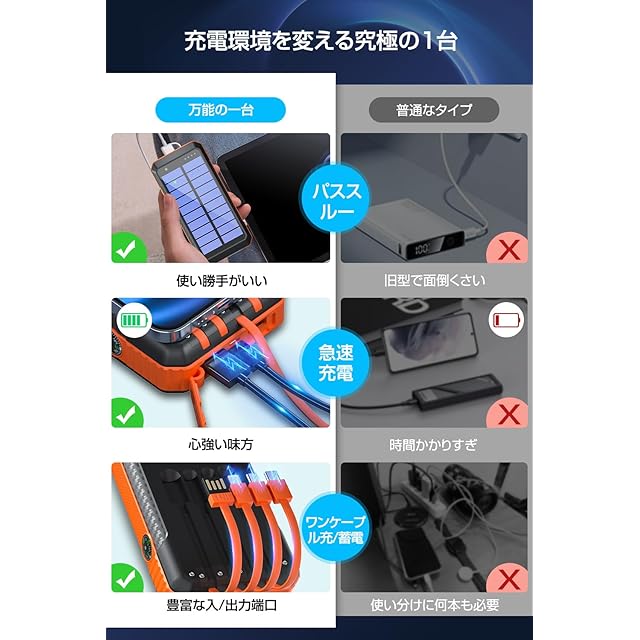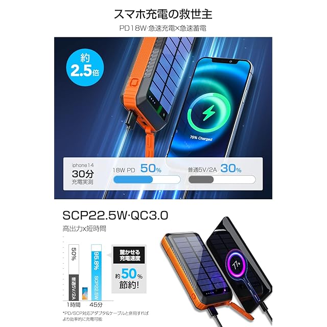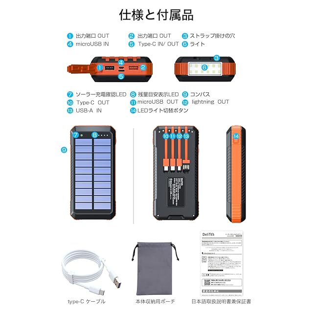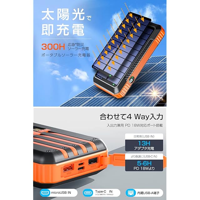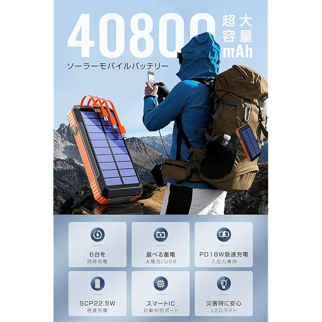 商品名:ソーラーモバイルバッテリー 大容量 40800mAh 【22.5W/PD18W急速充電 4本ケーブル内蔵】 6台同時充電 ソーラーチャージャー モバイルバッテリー Type-C入出力ポート 4way蓄電 IP67防水 防塵 耐衝撃 LEDライト付き コンパス搭載 ソーラー充電器 アウトドア/旅行/地震/災害/緊急用 防災グッズ iOS/Android各種他対応 (ブラック×オレンジ)