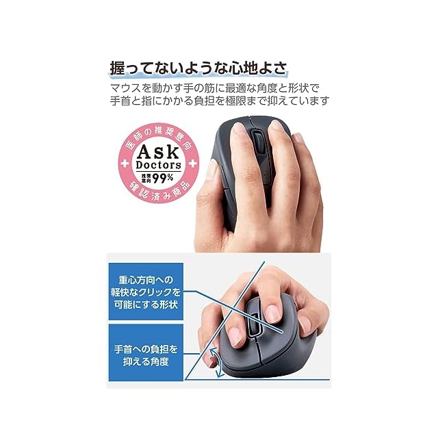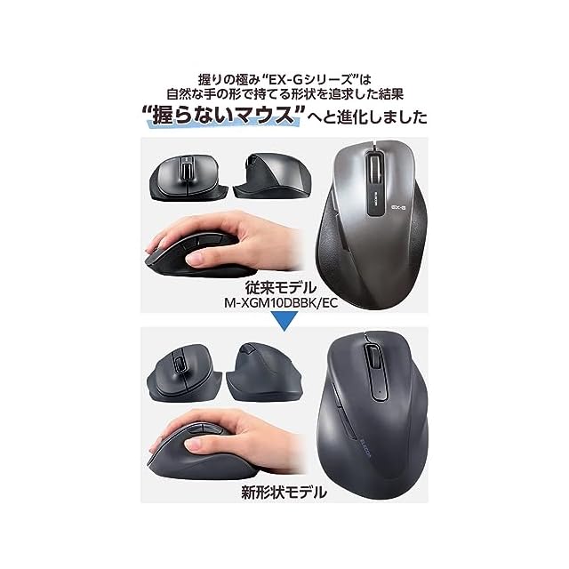 整形外科医との共同開発により自然な手の形のまま使える、握らないマウス“EX-G"シリーズ。手首と指を動かす筋に着目し、マウスを動かす際にかかる身体の負担を極限まで抑えた無線2.4GHz5ボタンマウスです。