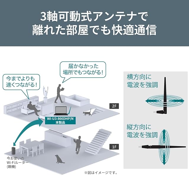 【外付けアンテナ飛びが向上】3軸回転に対応した外付けアンテナにより、角度を調整し、通信速度を向上させることができます。