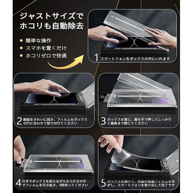 【最新なフィルム貼り付けデザイン・2ステップで簡単に貼り付け】MINIKA iPhone14Pro ガラスフィルム の画期的なバリ楽BOX。このボックスには自動位置決め機能を搭載し、埃や気泡が埃除去フィルムを剥がした直後に即座に排出されます。iPhone14Proをボックスに入れ、14Pro ガラスフィルム をフレームにセットし、ガイドテープを引き出すだけで、素早くずれずに取り付け可能です。