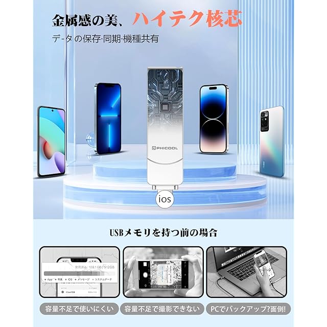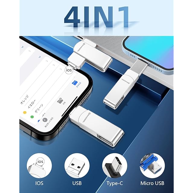 PHICOOL 4in1 USBメモリ 256GB【完全アプリ不要】から直接保存 外付けストレージ ▼3秒で始まるスマート生活 phoneのアルバムを開く→保存したい写真を選択→「USBへ転送」をタップ。 これだけで瞬時にデータ保存!クラウドサービスの月額費もWi-Fi環境も不要。 ▼2024年最新モデル完全対応 └ 16 Pro Max/16シリーズ~ 8まで全世代対応 └pad Pro(M2チップ搭載機種)/MacBook Air 15インチ等最新端末でも安定動作 └Type-C××USB3.0×MicroUSBの4WAY接続 ▼PHICOOLだけの5大革新 軍事級保護:航空アルミニウム合金ケース+内部緩衝材で2m落下耐性 超直感設計:カラー図解マニュアル+動画サポート(日本語専任スタッフ常駐) 潔癖症対応:抗菌加工ライトニングキャップ(99.9%菌繁殖抑制) 完全静音:無駄なLEDランプ廃止で会議中も安心使用 和風美学:桜模様刻印の収納ポーチ付属 ▼こんな方に必需品 ✓「Cloudの課金を解約したい」 ✓「孫の動画でスマホがパンク寸前」 ✓「機種変更時のデータ移行が面倒」 ✓「ビジネスデータの物理バックアップが必要」 ▼仕様詳細 ・転送速度:HD動画1GB約12秒 ・対応形式:HEIC/RAW/MP4/PDF等37種 ・動作環境:-20℃~60℃(雪山旅行でも問題なし) ・サイズ:親指サイズ(5.8×1.4cm) ・重量:ストラップ付きでも3.5g