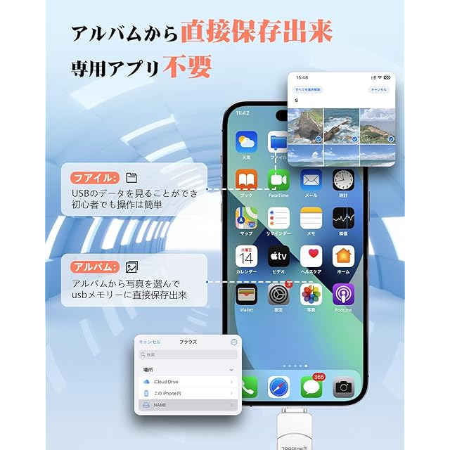 【完全アプリ不要の直感操作】対応USBメモリ256GBは完全アプリ不要設計。アルバムを開いて写真/動画を選択するだけ!3ステップ(選択→タップ→保存)でから直接usbに写真を移す可能。端子を挿すだけで外付けメモリ 自動認識、機械操作が苦手な方でも迷わず使えます。