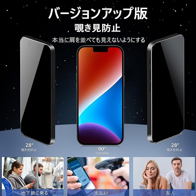【覗き見防止・プライバシーフィルム】 覗き見防止技術により、左右の視野からの視線を防ぎ、画面のプライバシーを守ります。電車などでも安心のプライバシー保護フィルムです。MINIKAのiPhone14Plus 覗き見防止フィルムは斜めから見るとブラインドルーバーにより画面が真っ黒になりますが、真正面から見ると高透過率ではっきり見ることが出来ます。