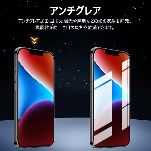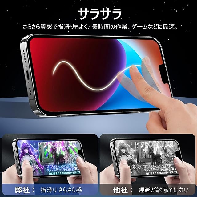 【アンチグレア・指紋防止・高感度タッチ】 アンチグレア(非光沢)タイプのさらさらで快適な操作感。光の反射を軽減し、より目に優しくちらつきを抑えます。同時に、iPhone14プラス ガラスフィルムには撥油コーティングが施されており、指紋や汚れなどに強くなめらかな操作感を実現、付着した汚れなどは簡単に拭きとれます。こちらは高耐久撥油コーティングが施され、つるつるな滑り感を実現!ゲームをする人におすすめです。