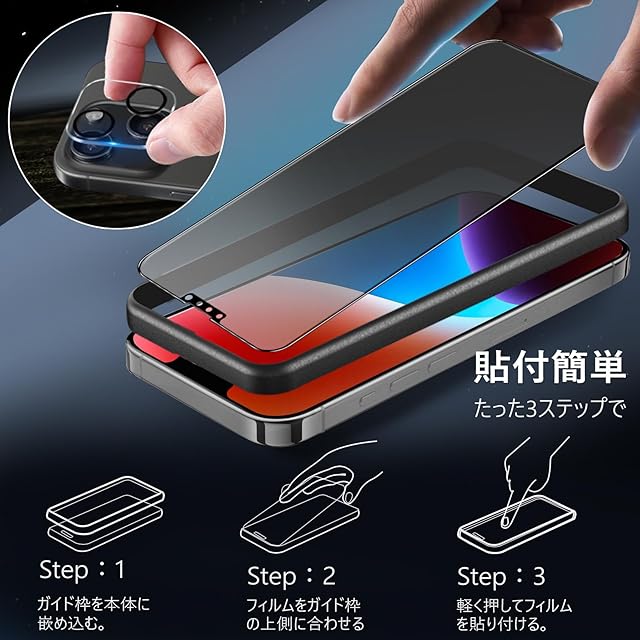 【ガイド枠付き・貼付け簡単】 ガイド枠をはめる→上側に合わせて、 いPhone14Plus ガラスフィルムを置く→軽く押すだけで自然に吸着。 フィルム貼りことが苦手の方でも簡単に貼る事が可能です。また、縁にラウンドエッジ加工が施されており、iPhone本体の縁に適度なスペースを残すデザインとなっており、フィルムの剥がれや浮き上がりを防止し、スマホケースと干渉せずに快適に使えます。
