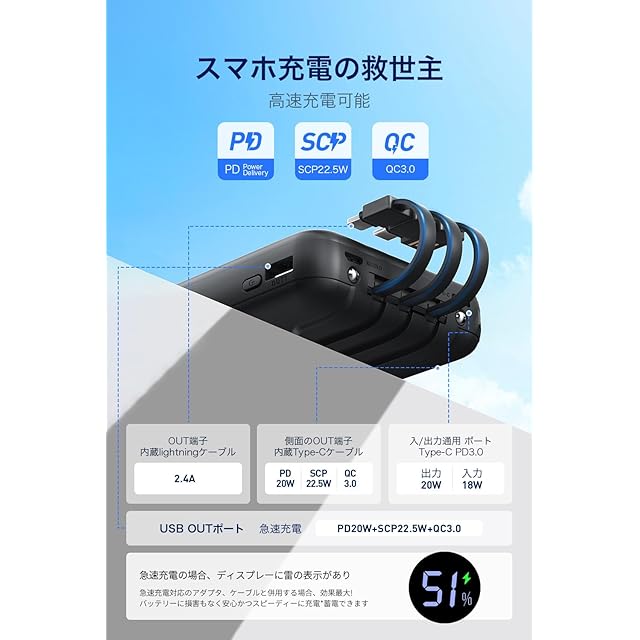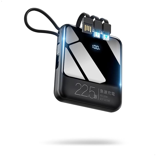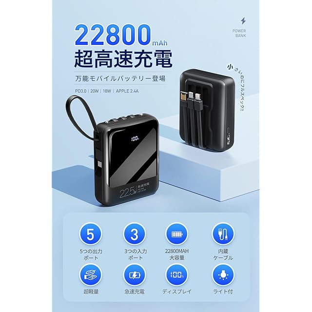 商品名:モバイルバッテリー 小型 【大容量22800mAh 22.5W/20W急速充電】 4本ケーブル内蔵 5台同時に充電 超軽量210g 携帯バッテリー スマホ 充電器 LED残量表示 Type-C入出力ポート搭載 ストラップ付き 持ち運び便利 LEDライト付き 携帯充電器 PSE技術認証済 旅行/出張/アウトドア/停電/緊急/防災用 機内持ち込み可 iOS/Android各種他対応