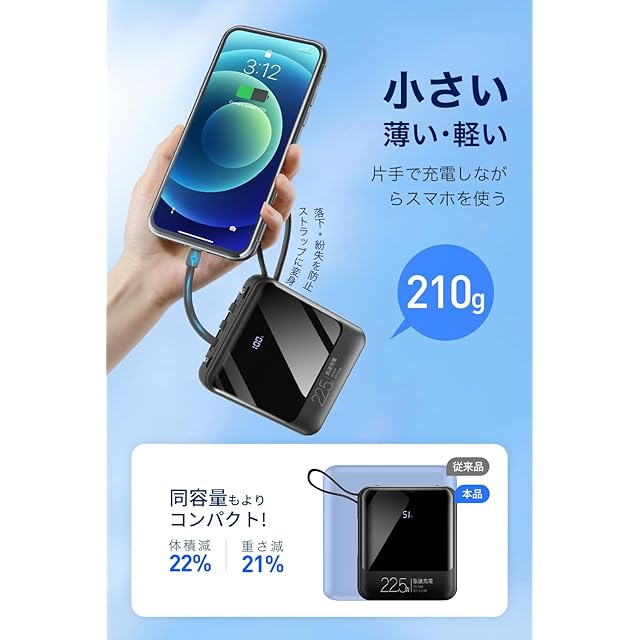 【22800mAh大容量・小型軽量・携帯充電器】ポケットにもすっぽり収まるほどのコンパクトサイズでありながら、22800mAhと大容量バッテリーを備えるモバイルバッテリーです。スマホ、タブレットを含め、携帯扇風機、Bluetoothイヤホン、スマートウォッチ、ゲーム機など様々なデバイスにも複数回の充電が可能で、旅行、出張、アウトドアでもバッテリー切れの心配がありません。さらに、210g超軽量タイプで持ち運びにも負担にならず、内蔵ケーブルがストラップのように使えるため、携帯性も抜群な小型モバイルバッテリーです。
