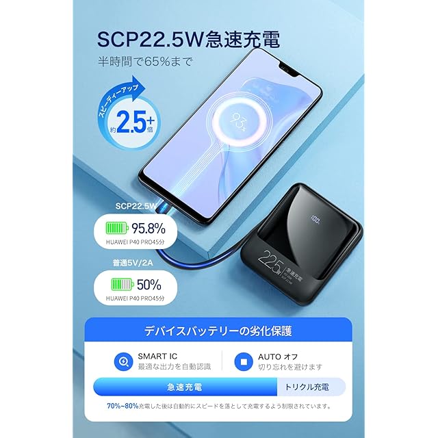 【SCP22.5W/PD20W急速充電 高速*効率に充電】PD3.0に対応し、最新な急速充電技術を採用しており、圧倒的な充電スピードを持る急速充電器です。PD対応機種であれば、わずか30分で半分以上充電することが可能になり、通常に比べて充電速度が約5倍速く、充電時間が大幅に短縮されます。Huawei Super Charge SCP22.5Wにより、充電効率がアップして対応するデバイスを高速充電可能、急ぎの時も待たせません。さらに、急速充電に対応しない機種でも、SmartIC機能によりデバイスを自動で判別し、最適な出力で充電を行うことができます。