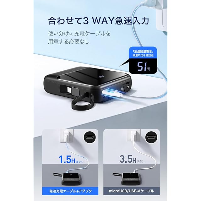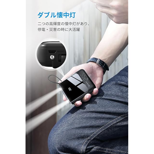 【3way入力・残量表示・LEDライト付き】バッテリー本体の充電はType-C入出力ポート、内蔵USB-A入力ケーブル及びmicroUSB入力ポートの3種類から選べます。液晶ディスプレイにより、電源ボタンを押すだけで、モバイルバッテリーの残量を数字%で分かりやすく表示されて一目瞭然、充電のタイミングも把握しやすい。また、LED照明ライト付き、夜道や停電時で懐中電灯代わりに使え、緊急時にも役立ってくれます。