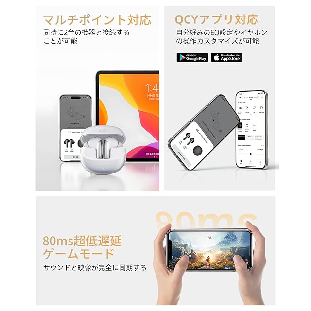 【最大34時間音楽再生】イヤホン本体が満充電の状態で最大8時間、付属の充電ケースを合わせて使うと、最大34時間の音楽再生が可能です。また、10分の急速充電で2時間のリスニングが可能に。急な外出や通学通勤にも便利です。テレワークや、在宅勤務、ゲーム、運動にも対応できます。【専用アプリ「QCY」】強制登録不要、バッテリー表示、カスタマイズ可能なタッチコントロールとEQなど豊富な機能をご利用いただけます。【12ヶ月の安心】万が一製品に不具合があった場合や正常な使用中の故障の場合は、期間内には新品交換、返品、返金などの対応をさせていただきます。