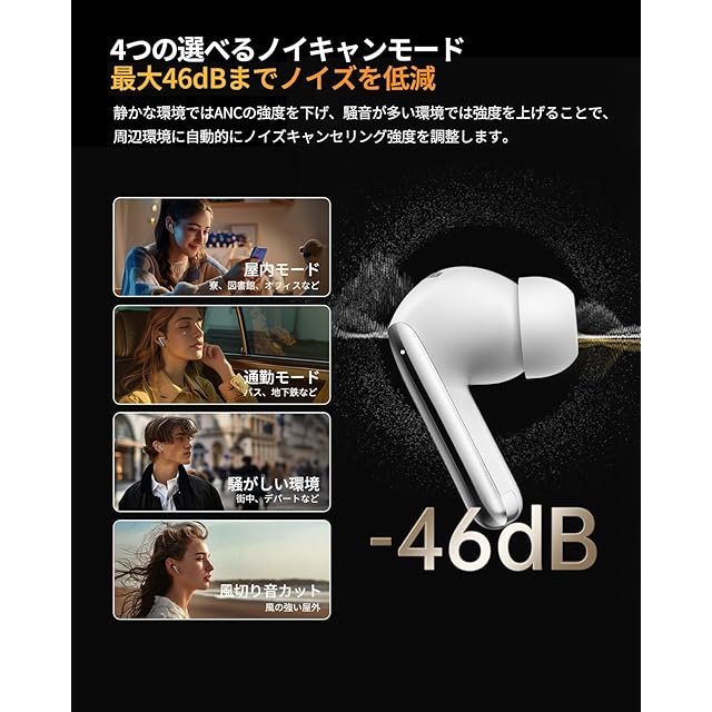 【驚きなノイズ低減効果】周囲の環境音の多さに合わせて自動的に強度を変化させるアダプティブ・ノイズキャンセリングを搭載し、イヤホンの装着状態や耳の形状に合わせて、周りの騒音を自動的かつ持続的に調整できることで、図書館や電車で音楽を存分に楽しむ。QCYアプリでお好きなノイズキャンセリング強度をご自由に選択いただけます。最大46dBのノイズキャンセリングを実現し、忙しいワークスペースや混雑した公共交通機関にいても、音楽を存分に楽しめます。