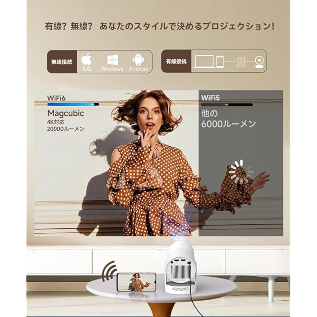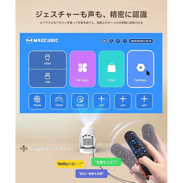 商品名:プロジェクター 家庭用【電動フォーカス・HiFiスピーカー】Magcubic プロジェクター 小型 Android TV搭載 180°回転 天井投影 20000LM ぷろじえくたー 4K対応 Wi-Fi6 Bluetooth5.4 自動台形補正 ズーム機能 短距離投影 一人暮らし ホームプロジェクター スマホ/タブレット/ラップトップ/TV Stick/USBドライブ/PS機など対応(白)
