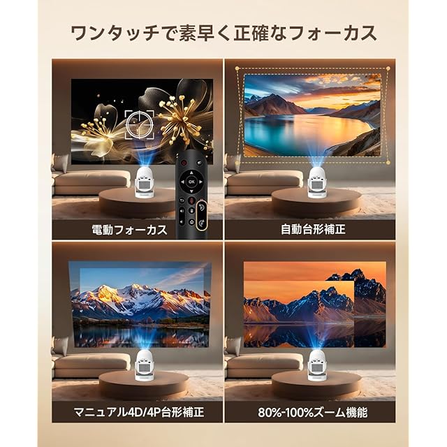 電動フォーカス/自動台形補正:従来の手動調節を置き換えるインテリジェント電動フォーカスシステムを搭載。リモコンのボタン一つで数ミリ秒以内に精密な焦点調整が可能。プロジェクターを移動させてもワンタッチで画面キャリブレーションが完了し、友達と大画面映画を共有する際の面倒な調整が不要。自動上下台形補正と80%-100%ズーム機能により、設置位置が変わっても画像の歪みを自動補正。時間節約と正確な映像を両立し、家具配置や視界を気にせず自由な設置が可能。
