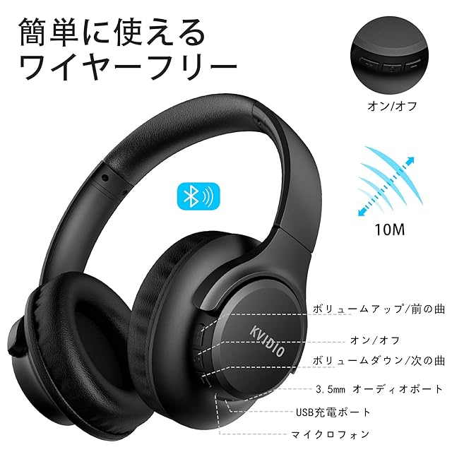 商品名:ワイヤレス ヘッドホン KVIDIO Bluetooth 5.3 65時間再生 ヘッドホン 40mm HD ドライバーユニット オーバーイヤーヘッドホン マイク内蔵 ヘッドホン 有線 無線 両用 遮音 密閉型 ハンズフリー通話可能 ブルートゥース ヘッドフォン ブラック (黒)