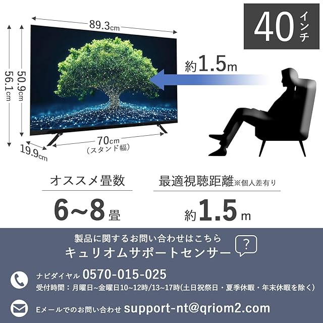 ✅【商品仕様】◇本体寸法:[スタンドなし]893×82×509mm [スタンドつき]893×199×561mm ◇本体質量:[スタンドなし]5.5kg [スタンドつき]5.6kg ◇画面サイズ:40V型 ◇解像度:1920×1080 ◇コントラスト比:5000:1 ◇アスペクト比:16:9 ◇視野角:H/178°V/178°(標準値) ◇フレームレート:60fps ◇最大スピーカー出力:6W+6W ◇Bluetoothバージョン:5.0 ◇無線LAN:2.4Hz/5GHz ◇壁掛け寸法:VESA規格200×200 ◇付属品:スタンド×2(ネジ4本含む)、リモコン(動作確認要単4形乾電池2本含む)、取扱説明書、書、専用AVケーブル、VESAネジ×2(ST4×10mm・下側用)