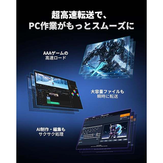 【超高速・作業を快適に】ゲームやアプリの起動はもちろん、ストリーミング配信やキャプチャもスムーズにこなせる圧倒的な応答性を実現。高パフォーマンスなデスクトップPC・ノートPCに最適で、ワークフローを飛躍的に向上させます。