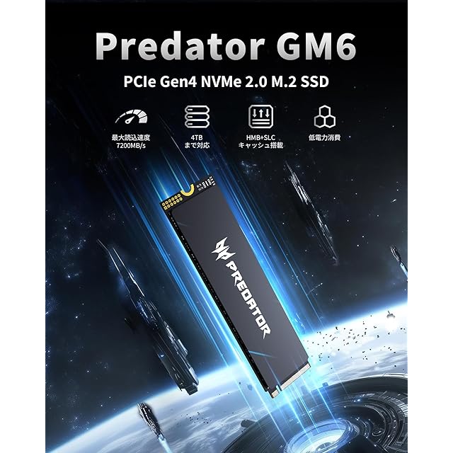 【Acer Predator GM6 SSD】AcerのゲーミングブランドPredatorが誇る最新技術を搭載したGM6 M.2 SSD。最新のGen 4x4 NVMe コントローラと3D QLC NANDが搭載され、最大7,200MB/sの読み取り速度、6,200MB/sの書き込み速度で、ゲームのロード時間を短縮し、大容量データの転送も驚くほどスムーズに。ハイエンドゲーマーやクリエイターの求めるスピードと安定性を実現。