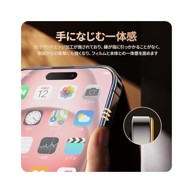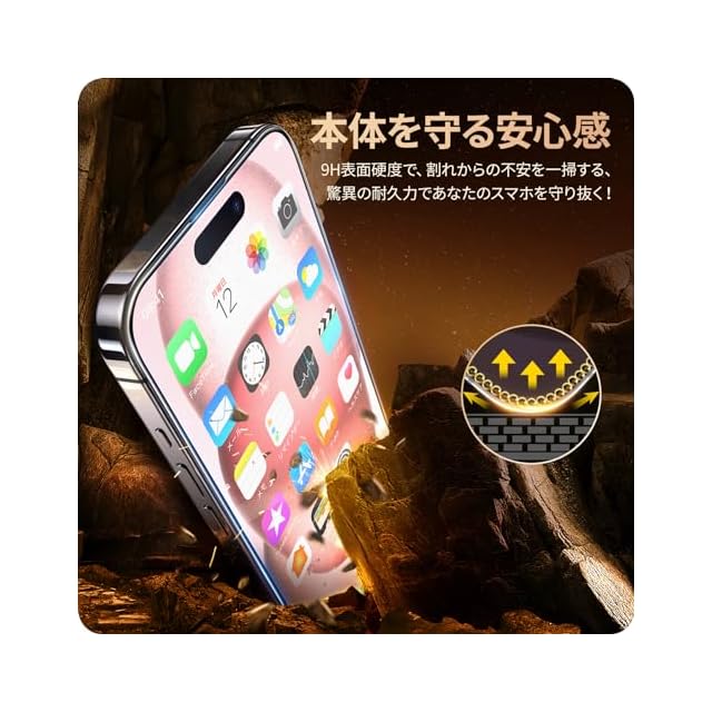【黒縁全面保護・耐衝撃性アップ】黒縁取りでスマートフォンの画面をフルカバーして、落下や衝撃による損傷からスマートフォンを守ります。9H表面硬度ガラスを採用し、スマートフォンがカバンの中で、鍵などの鋭いものにぶつかっても傷が付きにくく、アイフォン 15 の画面をしっかり保護します!また、飛散防止加工により、万一割れてもガラス破片が飛び散ることなく安心です。